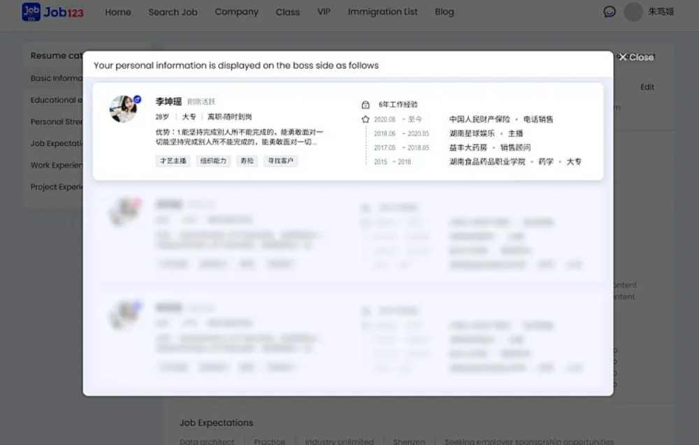 ③可选择“名片展示”的形式代替传统的文字简历,求职者上传简历之后可以一键生成名片展示效果,将高光时刻悉数呈现在雇主面前。